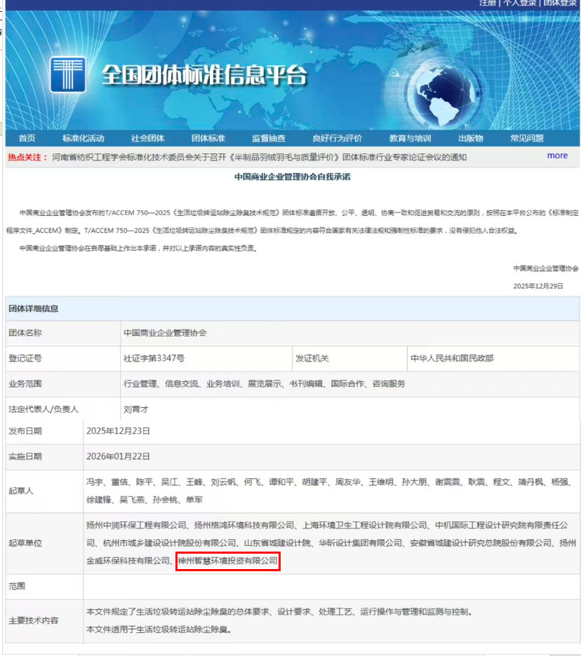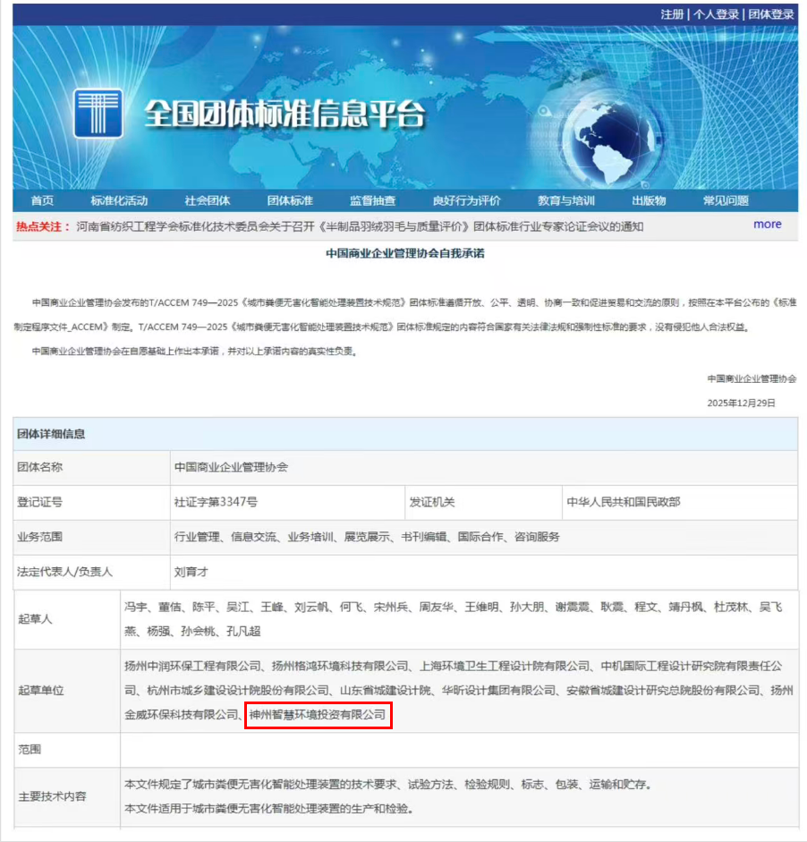 近日,我国城乡环卫领域标准化建设迎来新突破。神州智慧环境投资有限公司(以下简称“神州环境”)凭借在固体废物处理和城市环境卫生领域的前沿技术与丰富实践经验,作为核心起草单位深度参与了《生活垃圾转运站除尘除臭技术规范》和《城市粪便无害化智能处理装置技术规范》两项团体标准的制定工作。目前,两项标准已由相关行业协会正式发布实施,标志着公司在环保技术创新和行业标准建设方面迈出重要步伐。