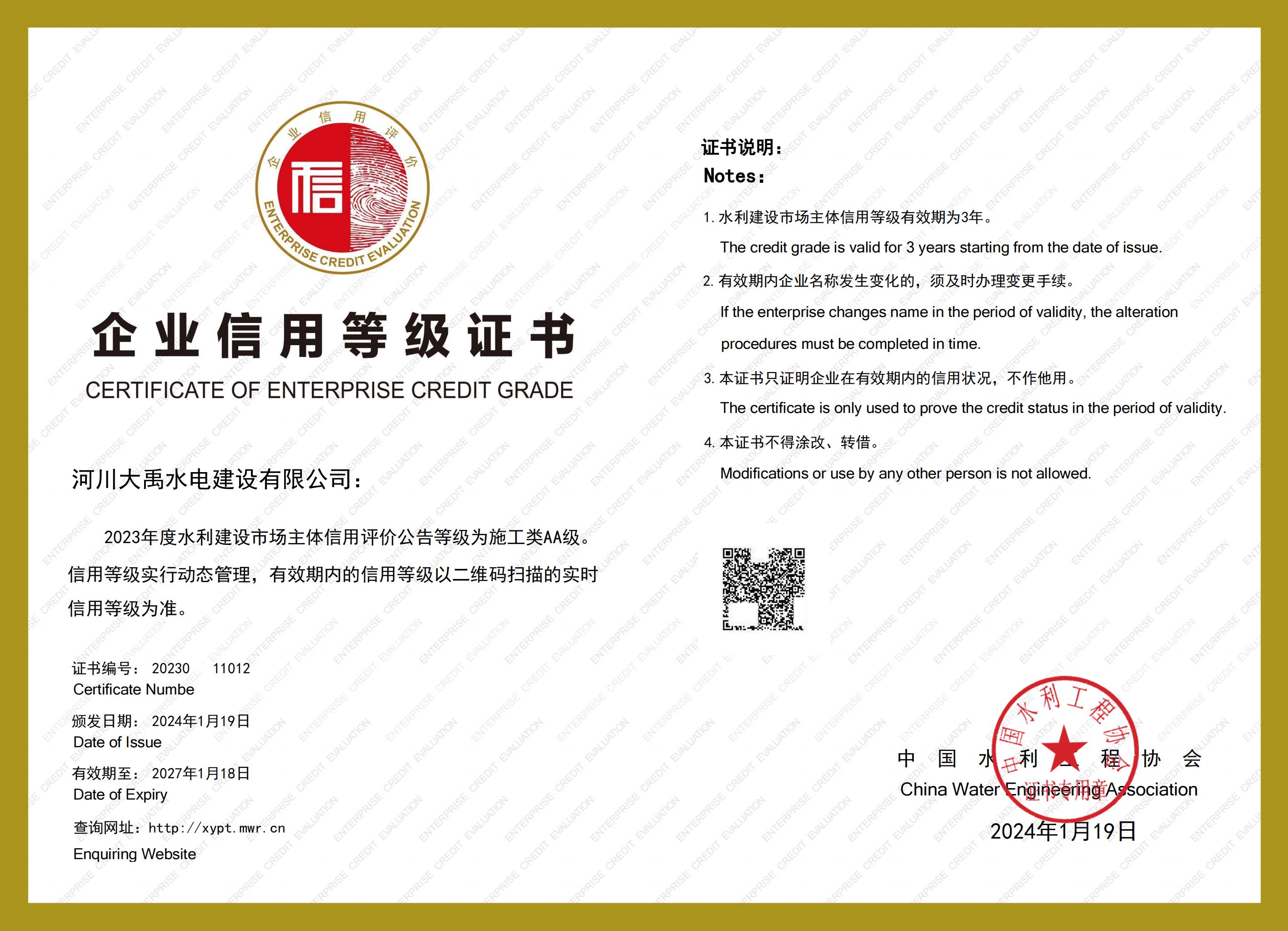 信用等级证书是市场准入、招标投标、评先评优等活动的重要参考依据。当前,经济形势发展缓慢,建筑行业市场持续低迷,市场竞争愈加激烈,此次获评AA信用等级,进一步提高了河川大禹的社会影响力和市场竞争力,为进一步稳定公司发展态势,推进集团高质量发展奠定了坚实的基础。