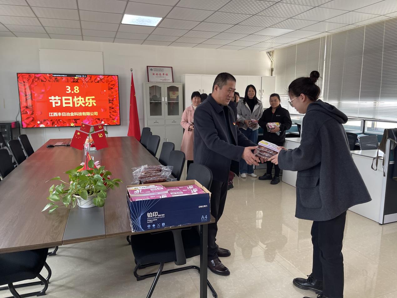 春意融融,百草吐芳。在国际劳动妇女节来临之际,为了让全公司女职工度过一个充实愉快、富有意义的节日,3月8日下午,江西丰日冶金科技有限公司(以下简称“丰日冶金”或“公司”)董事长丁林厂代表公司向辛勤工作在一线的女职工送上节日祝福,并派发节日礼物。