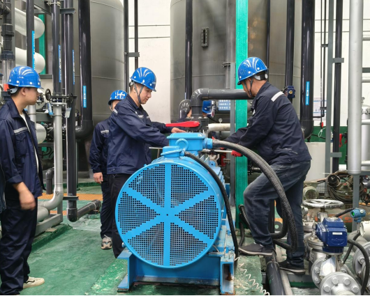 图为污水车间技术负责人张学渊(左二)和同事们调试设备
